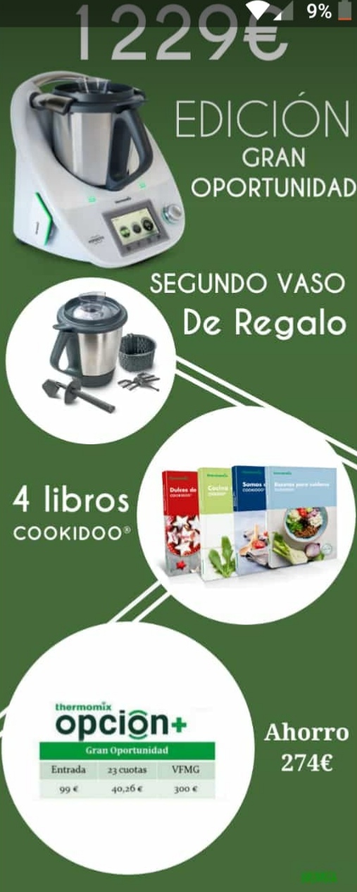 Holaa!! Esta es la mejor oportunidad de conseguir su thermomix, con un segundo vaso de regalo, la mejor edición hasta el momento, quedan pocas unidades, disfruta de su thermomix cuanto antes, y con la posibilidad de pagar con opción +, una forma de pago accesible, comoda y segura, le informo encantada.