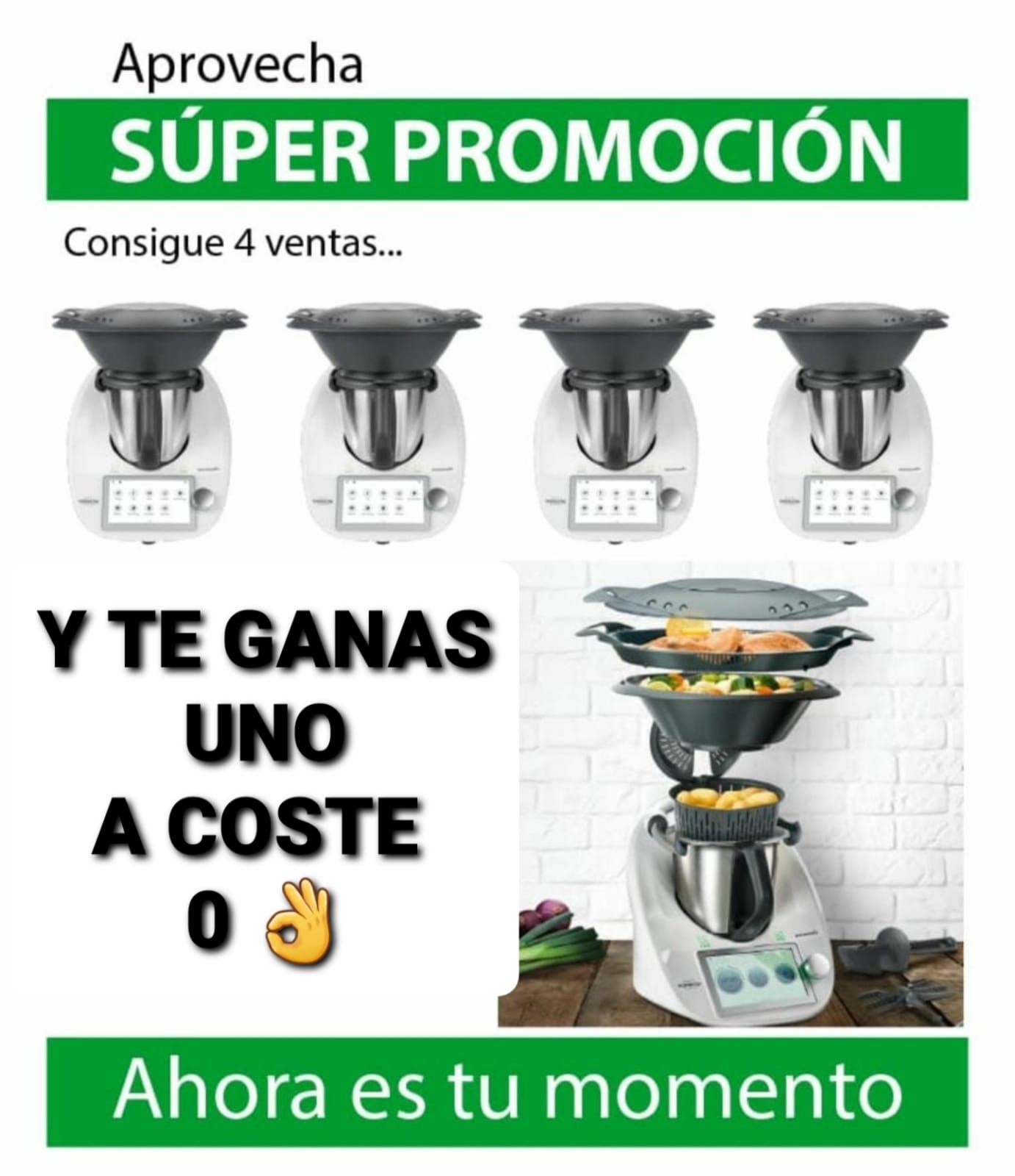 Hola a todos!!!!quieres ganarte tu thermomix sin coste ninguno?Pues aora es tu momento,con tus ganas y mi experiencia lo vamos a conseguir!!!!Siempre para ganarte la máquina tenéis que vender 6 máquinas pero aora solo con cuatro el thermomix es tuyo!!!!quieres intentarlo? Pues llamame y te cuento cómo hacerlo